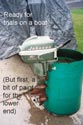 A couple years ago I bought several cans of automotive spray paint at a Big Lots closeout store because the colors appeared to be close to those of some old outboard motors, and anyway the paint was only 29 cents a can. I used some General Motors green paint, over zinc-chromate primer, to repaint the outboard from the bottom of it’s cowling down. Then I clamped the motor onto the auxiliary motor bracket on my AF4 in preparation for the upcoming Midwest Messabout, which would be the motor’s first test on a boat.