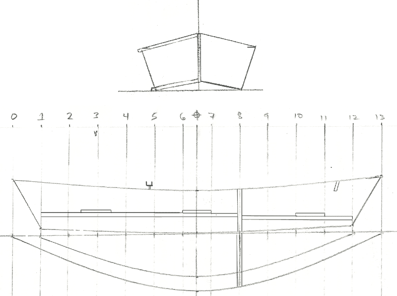 I chose to avoid epoxy, as the mess would certainly cause marital strife. This is a traditional ?” ply nail-and-glue skiff, as these can be worked with hand tools that won’t generate noise complaints. Since this is a pretty well-known method, stems, chines, wales and breasthooks are not shown in profile or plan views. The stems can be formed by whichever method is convenient, but I would form an inner stem from 1x or 2x and cap the finished stem with a strip. You’d only need a friend with a power saw to rip the chines, wales and stringers – possibly cut the panels. PL premium for glue and latex paint. Don’t even TRY to varnish in ‘her’ space!