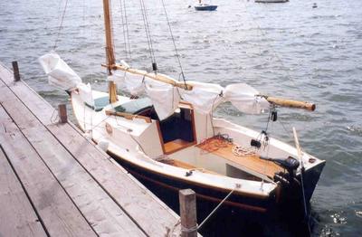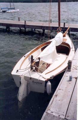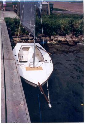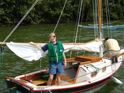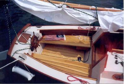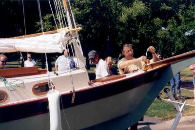 Jeff and June Tam brought their son Michael and their year-old Weekender. It’s always fun to see how builders modify the plans to suit their own needs. Jeff eliminated the lazarette and replaced the standard wheel with a tiller. Jeff is quite a craftsman, and even made his own wooden blocks for the running rigging.
