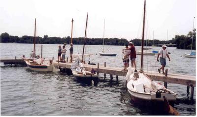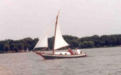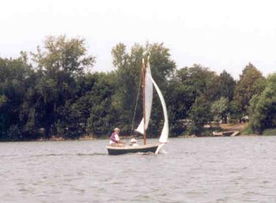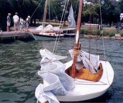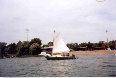 Chuck and Dianne Casterline brought Sawl T Dawg, their Skipjack. Chuck had made some serious modifications to the mast just that morning, and decided that the wind was a bit too high for testing the rig.