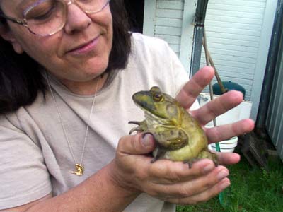 The other night Kaye and Shelby and the other grand daughter, Julie, who's 6, took a notion to catch a bunch of tree frogs as well as other frogs and toads around the creek and yard. They were successful and had 5 or 6 tree frogs in a small aquarium, a couple of bullfrogs in the pond and toads around the big bush by the steps after burning up 2 sets of brand new D-cells in my Mag lites. Then at 10 o'clock at night they decides...(I say decides cause they all thought of it at the same time and began a womanly argument amongst the 3 of them as to who thought it up first!).... to dig up the landscape and make a frog place by the Rhoderdindrum bush, right by the steps across the walk from Kaye's pond. "Her" pond is shown behind her in the pic with her and her damn Big Ass Bullfrog. What a man will do to keep grandkids and a wife happy!
