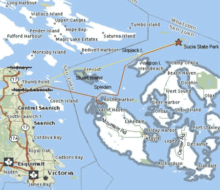 After trading some emails, we agreed to meet at Sucia Island – it’s a small State Park with lots of bays and anchorages, right at the north end of the San Juan group. It’s also within easy reach (about 25 miles) of Sidney, where we often launch. This was important as I only had two days for the trip. I’ve added a map, courtesy of Mapquest, at the end of this epistle for those who don’t know the area (most of us!)