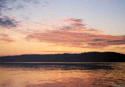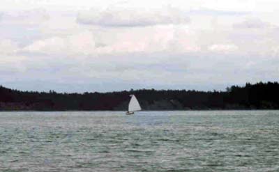 My almost fifteen year old son Alan came with me. We started on the Monday evening, leaving the dock in Sidney about ten to seven. We had to use the motor as there was no wind at all, despite earlier predictions of 15 knots in Haro Strait. We headed northeast around Sidney Spit, then just south of east across the strait for Roche Harbor. It was a straightforward run, and we arrived just after nine – we lost a few minutes when a breeze sprang up and we raised the sails, but the breeze didn’t last. We cleared customs in Roche Harbor, then had a look around. Nice, but Roche Harbor Marina is a pretty upscale sort of place – lots of big three-story power cruisers with acres of white fibreglass and big tinted windows. Wayward Lass felt a bit out of place there!