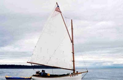 In June, Chuck Gottfried sent me an email saying he and Rollan, his bro-in-law, were cruising the San Juan Islands in early July, and wondering if Wayward Lass might find her way over there. We’d met at the Depoe Bay boat show, so we’d seen each other’s boats before, but we hadn’t seen them in action. Chuck has a 15.5 foot (it seems bigger!) Thomkat that he built – a real classic type catboat, barn door rudder and all. Wayward Lass is a Chebacco cat yawl – I don’t know if that qualifies as a “real” catboat, but she’s close enough for me.