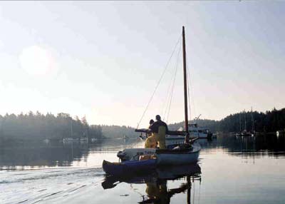The overlapping stone breakwaters at the Port of Sidney conceal the entrance very effectively. I was steering for the entrance marker, looking for the opening through binoculars, (without much success) when a power boat suddenly materialized as if from the stone! Once inside, at the customs dock we found a just-barely-big-enough space between two monster power cruisers, and achieved a very creditable landing through some nice teamwork. As we swung in, the starboard quarter was tucked well under the overhang of the bows behind, the mizzen sliding past the pulpit/anchor-roller/bowsprit with about six inches to spare. Clearing customs only took seconds, and we were off again, this time for the boat ramp. The recovery went just as smoothly, and soon we were unrigged, unpacked, and on the road home – a good finish to the journey. Alan and I agreed that it had been a good trip all around, even worth getting up before dawn!