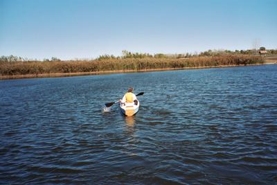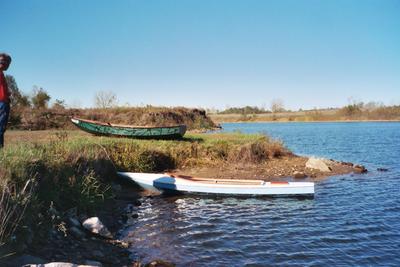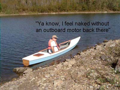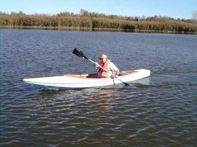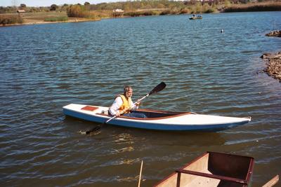 Jim went along on the first outing and had a chance to try-out the boat, as the photo above shows. He could find little fault with the way it handled. I found the boat easy to paddle with both a double-bladed kayak paddle and also with a single-bladed canoe paddle. I find sitting cross-legged on an ordinary boat cushion to be a comfortable paddling position. I do suggest keeping a sponge in the cockpit in order to remove the small amounts of "bilge water" that the double-paddle brings aboard.