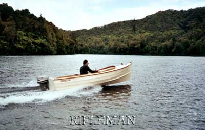 Hi Chuck, This is John Brogden of Hawera in New Zealand's North Island out in his Rifleman. She is powered by a 1988 15 hp Mariner, and he has since sold her to get on with another project.