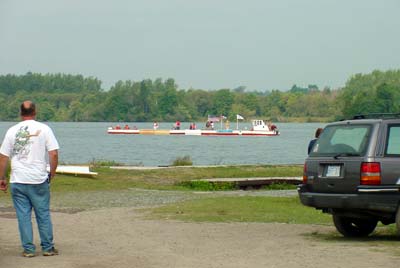 at the last minute. Here, Frank San Miguel & son caulk seams....