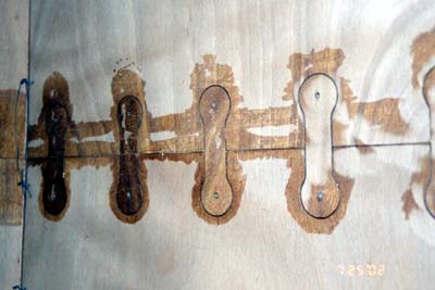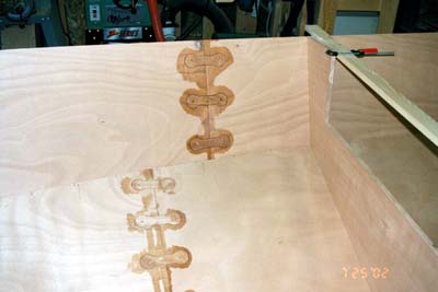 I came up with this method to scarf plywood together using a router and inlay techniques which did not shorten the plywood. I call it a dog bone scarf which comes from the appearance. [Figure 1] Normal plywood scarfs reduce the overall length of the plywood for the overlapping of the scarf. The dog bone scarf butts the two plywood pieces together and then adds interconnecting dog bones to strengthen the joint and allow the joint to flex the same as a normal sheet of plywood. Some of the precut kayak kits use a similar method to connect their precut pieces, sort of like a jig saw puzzle. See figure 1, 2 for finished joint on the boat. I used a layer of fiberglass on the inside and outside for strength, since the boat already had the outside fiber glassed only an area on the inside to cover the scarf is extra.