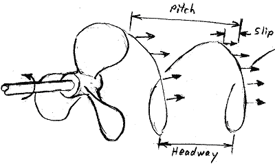 In the old days propellers were called screws. The idea was that they screw into the water, but it was noted that the actual headway was always less than what would happen if it really was cutting through water. Prop people refer to this difference as slip, leading some people to think it should be avoided, but slip is what accelerates the mass. If you have a small propeller and spin it fast you can generate the same thrust as a larger propeller moving more slowly, you have more slip. You’d use more power with a smaller prop because friction increases four times as you double the spin, while the force just doubles. There are limits, but generally the best efficiency comes from a big prop turning slowly with just a little slip. You’ll never see these limits approached in a motor boat but in something like human powered submarines you might see a 24” prop powered by a half horsepower set of legs. That is where the quest for efficiency turns into an obsession. Hydro jets go the opposite way and connect 300 horsepower to a 6” impellor.