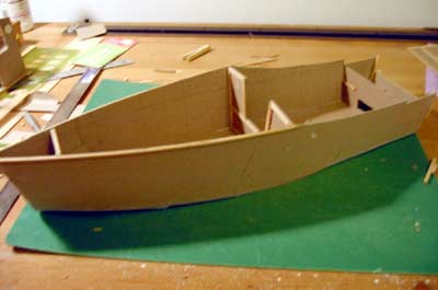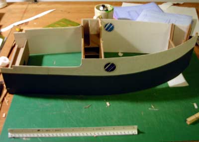 The next photo shows the model with the hull panels on but no bottom or decking. I’ve modified the flat run of the upper sheer aft of the cabin bulkhead for purely appearance reasons. I suspect that I will build the hull with the straight sheer shown in the plan for stability during construction and then cut the new pattern when the hull is turned over. The rub rails and details are not in place yet, but the color line shows that I am altering the curve of the lower rub rail somewhat. Also the astute observer will note that the portholes are out of whack. Oh well…