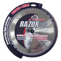 During the test I had a chance to switch blades on all of the 12” machines and to try out some unique blades that are just showing up in stores now. The 96t DeWalt DW7650 blade gave a nice finish but it wasn’t the stock blade on the DeWalt 12” slider I tested. The Freud thin kerf LU91R012 ATB 72t 12” miter blade gave the best overall performance in all of the saws until a new blade arrived from Oldham. The blade carried a Porter-Cable brand name but was designed at Oldham just before the merger with the Pentair Group. Can you imagine a variable tooth blade that has finish teeth and rip teeth on the same blade? I can because I used it and it’s called the RAZOR! It cuts butter smooth without much noise and also cuts much faster. I received one 12”, one 10”, and one 7 ¼” blade to test. See it HERE.