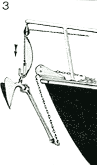 In use, the anchor is suspended from the hook by its neck (?) with the cable flaked out ready to run; not forgetting to make the bitter end fast! The hook is hung from its top, by a line running through a becketed block hanging from the bow, or pulpit, and back to the helmsman, and cleated off. A measured short line is shackled to the lower hole in the hook, and made fast to the becket of the block, with a bit of slack. When the desired spot is reached, the line through the block is eased a little, the hook turns over, and the anchor drops (pic #3)