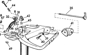 The throttle handle, to the left, is attached to a horizontal shaft which runs to the right and ends with a pinion gear, which engages another gear on a vertical shaft. The throttle cable for remote controls attaches to a lever on the gear on the vertical shaft (click to enlarge).