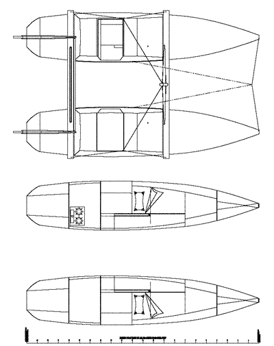 The two hulls are joined by a solid timber and ply-wood bridge deck sitting on the hull decks forward and aft of the deckhouses. The bridge deck beams are lashed in place, giving an arrangement that is simply and quickly assembled or disassembled for trailering.