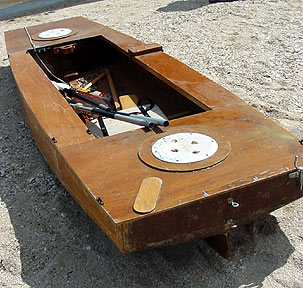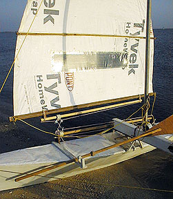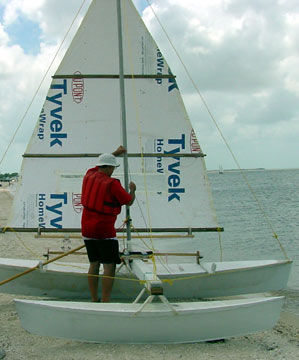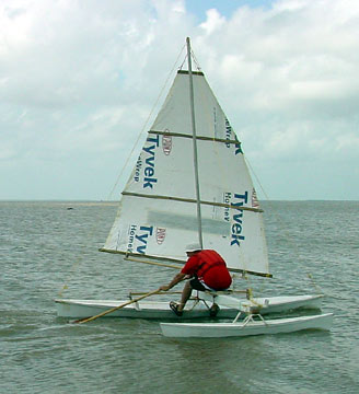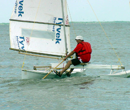 Skip Johnson (Cypress, TX) spent the afternoon assembling his proa, which started life as a $50 boat for a race that David “Shorty” Routh held at Lake Conroe last year. It is a spiffy boat, and he has since made modifications that took it out of the $50 category. He says it's up to about 75 bucks! I especially liked the way it was set up, with a seat for the operator.