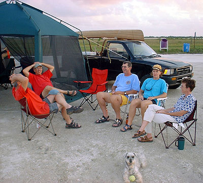 Technically, the Messabout was scheduled for Saturday, May 22, but Chuck and I drove down Thursday. Our excuse was checking out the details of the spot (like we could change it at that point), but really we just wanted a little time for messing about in our boats before everyone else arrived. We stopped in Victoria to see Charlie Jones. He is building a Princess 22 from B & B Yacht Designs. She is coming right along, not quite as fast as he had hoped, but coming ever closer to seeing the water. He announced that he was cooking dinner for us, an unexpected treat, especially for me. Instead of skillet stew from cans, we had barbequed chicken. Charlie and Laura live in the quiet town of Magnolia Beach. Laura is becoming well known on the Texas coast for her paintings of seabirds and other local scenes. For a visual feast, log onto her website at: https://www.griffithart.com. What with after dinner conversation and BROWNIES (yum), it was dark by the time we drove on down to the park. I think we could set our tent up blindfolded by now, and once the air mattress was inflated, we fell inside and dreamed.