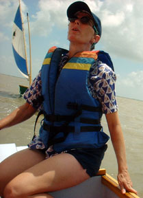 Laura at the helm of the Ladybug. Laura helped Chuck tweak the sail trim on the Ladybug and pronounced her an excellent little boat.