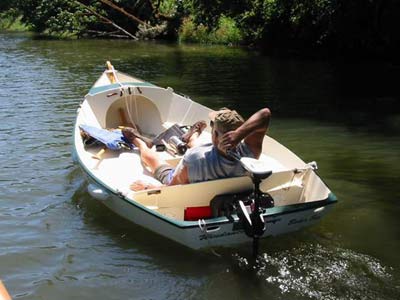 John has a pretty cool extension now the a push pull steering with twist speed control on the extension. Much more comfy, and gets his weigh further forward for better trim. I believe that is John McCallum, the designer and builder of John Kohnen's McKenzie Skiff testing the extension.