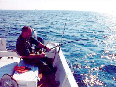 the harpoon on top of the cabin, and hit the fish. Gary yelled