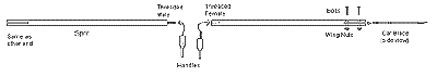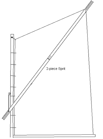 My apologies for the crude drawings, but I think they get the point across. It is a 2-piece sprit that screw together like a 2-piece pool cue. The slots on either end are for the snotter and the peak of the sail.