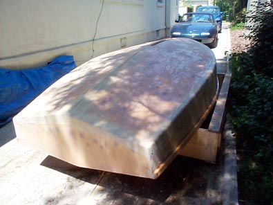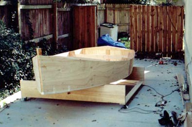 You can see in the photos that I built a cradle, tracing and cutting the shape of two of the frames. I almost set it up on concrete deck piers for stability, but I'm glad I decided at the last minute to put it on casters. If I were to do it over, however, I'd make the cradle a bit higher, as I've had to bend quite a bit in taping seams, and I think my lower back would have been happier at a higher working height.