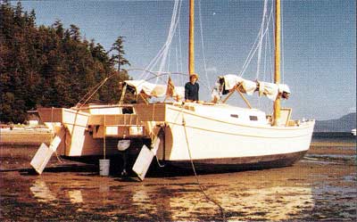 It goes back to when we were living on our first catamaran, Sea Urchin, a 46' Wharram Polynesian cat that we built and launched in 1974. During the year and a half that it took to build Sea Urchin I toyed with the idea of trying the junk rig, which Wharram offered at the time, but finally decided against it because Iwas afraid to try something that I didn't know anything about. Our cutter rig was adequate, but we didn't like getting the jib down on the bow netting, in rising winds with cold saltwater splashing up our legs, or tying in a reef in the main knowing that maybe in half an hour we might want to take it out again. Also, tacking two headsails was bothersome in the channels and fluky winds that make up 90% of the sailing here in the Pacific Northwest. When the weather got rough, flapping sails and whipping sheets seemed to add to our anxiety. Our experience led us to the conclusion that with just two adults and a young child on board, our boat should be the ultimate in singlehanding ease. On a long passage while one parent is sleeping, the other is responsible not only for the boat, butfor the child as well. All these thoughts led us to consider the Chinese rig as developed by Jock McLeod and Colonel Blondie Hasler.