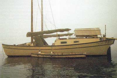 A year and a half after drawing the lines, Dragon Wings number one, Puff, was ready to be launched. April Fools Day, 1980 - we hoped we weren't the fools, but we would soon know. She floated well. A month after launching the rig was finished and we went for our first sail. She wouldn't point as high, or go as fast close-hauled as a sloop, but she got us where we wanted to go with style and ease. Although a ghoster set flying would help the windward performance in light winds, we never felt it was important enough to get one.