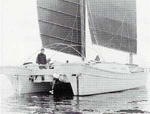 Dragon Wings was designed for comfortable living aboard and cruising. She was not a high-speed boat because of her wide, 7.5 to 1,length-to-beam ratio hulls. She'd do just 8 knots in protected waters, but she'd surf with the best of them in the ocean when the seas were 8' or more. I'm sure we hit 20 knots on 20' seas. She's certainly not the type of boat for someone who can't stand being passed by another boat - most boats passed her to windward, especially in light airs - but downwind she'd pass almost anyone not flying a spinnaker. Since she's meant mainly for ocean cruising, I think the downwind efficiency and ease of handling are very important. It's rare that any cruiser makes a passage dead to windward, no matter how good the boat is on that point of sail, yet downwind ability is usually "added on" after the rig has been designed to go to windward. The result is awkward and hard-to-handle spinnakers, whisker poles, and running twin jibs that can only be used downwind. On Dragon Wings we used the same sails all the time and had no sails to store below.