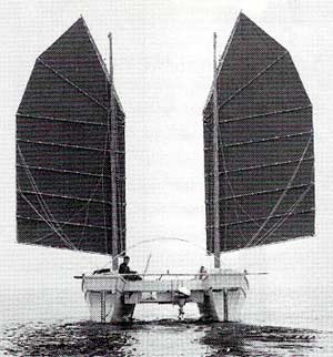 We made our tirst offshore passage from the Queen Charlotte Islands to California, and I started trying to design "the next boat," that would, I hoped, incorporate the junk rig. I especially liked the unstayed version that I had read about, because there was no chafe of the yard against the shrouds, and the sails could be sheeted out farther. I thought a trimaran or monohull were the only possibilities for this rig because the masts have to be stepped in a hull to have enough "bury" to be self supporting. I sketched quite a few possibilities but none of them excited us too much. We had become attached to