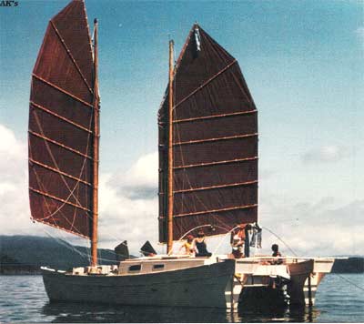 The time of decision had arrived. Did we really have the nerve to build that crazy boat with the junk sail on each hull? Wouldn't it be more prudent to build an existing design, one that would be sure to work and have good resale value? I had many misgivings, for sure, but my wife, Joanne, knew that if we never built it, I would forever be a frustrated designer, afraid to try something new. She encouraged me to give it a go. We told ourselves, over and over, all the reasons why it would work, and a few of the reasons why it might not. And we figured that if it was a complete disaster we could change the rig and keep the hulls. So, with our life's savings in-hand we boarded a jet and headed back to where we had started from four years