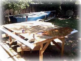 He laughed and went back working on my sole. The mast you may see in the background belongs to Mr. Vern, and so does the Snipe. (Yes, he built that himself as well.) On the spar bench is my forward bulkhead. Mr. Vern and I were under a shade tree that day. It was a very hot day.
