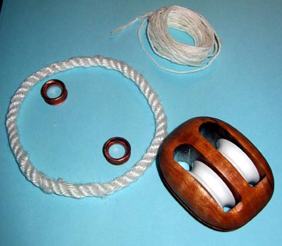 When considering what material to use for my seizings, I first considered the traditional material, tarred hemp marline. Hemp, a natural fiber, was not especially well matched to my polyethylene-sheaved and polyester-stropped blocks. And, after pricing tarred hemp marline, I considered whether there are any less costly, yet suitable alternatives. Several of the marine supply houses also carry tarred polyester marline. But, it too is expensive.