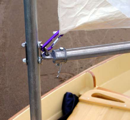 Note the carbiner that attaches the tack to the u-bolt. This one is much bigger than the ones used to attach the sail to the PVC rings.
