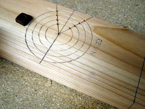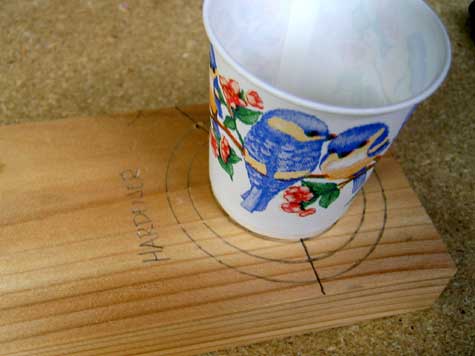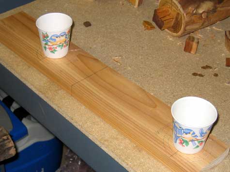 For the Raka epoxy I currently have, the mix ration is 100:43 (a little more than 2 parts resin to 1 part hardener by weight). So, the resin cup must be 43 parts from the pivot and the hardener must be 100 parts from the pivot. I drew concentric circles to help position the cups.