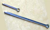 But I did think ahead about capsize. This is a weakness of typical rudder hardware. Notice the holes in the tips of the pintles. These are for cotter pins so we don’t drop our rudder assembly if we capsize, but still can remove it with minimal fuss. There are two kinds of cotter pins familiar to anyone with a boat trailer. There’s the standard cotter pin (below left), which locks the castle nut that holds your wheel bearings into the hub. Then there’s what I now know is called an “internal hitch pin” (below right). This is the one that goes through the pin that holds the hitch insert in the receiver. You can see how the cotter pin would be a pain and the hitch pin is easy. Best of all for those less neurotic than I, this modification can easily be applied to standard rudder hardware.