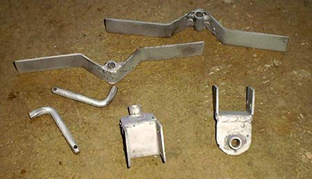 Pictured above are the first parts I cut, along with the cardstock patterns, soapstone holder and trusty grinder. The white lines that look like chalk are soapstone. This is made for marking metal. For a dollar you can find one at a decent building supply store. You sharpen this kind of “pencil” on your grinder. Those lines are the bending lines. I did this as mentioned above, by clamping the piece in a vice and tapping with a hammer. All the bends on this set of hardware, even the pins, were done cold.
