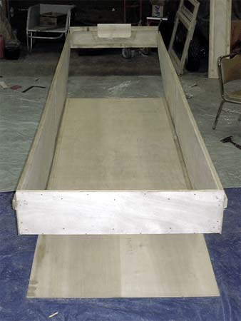 Pick up the hull by the transoms (gently, now) and set into position on the bottom assembly, aligning the aft hull side angle apexes (apexi?) with the ballast plate’s aft edge. Make sure about this, and watch the moving drama of self-rectification unfold from this point onward. The ballast plate serves as the nailer for the sides. At this point, the cabin hull is complete, but you have a bow flap. Turn the hull over onto 4x4 or larger blocks (to spare the beveled transoms... they don’t need to be more than roughly true). Sit on that flap (gently guiding it into the rabbet formed by the bow nailers and the bottom of the bow transom) Nail from aft toward the bow. Trim the overhang, if any.
