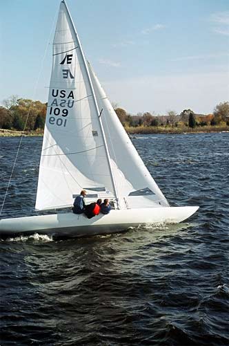 Suppose you get an Etchells rig, and with it, some secondhand deck gear. USA 109 above is currently for sale for 12,500 US so you can see that you can buy an entire Etchells and trailer for less than what you might spend on a custom one-off rig. Is a bit small but the jib foot is only 8 feet, you can add a bigger jib.