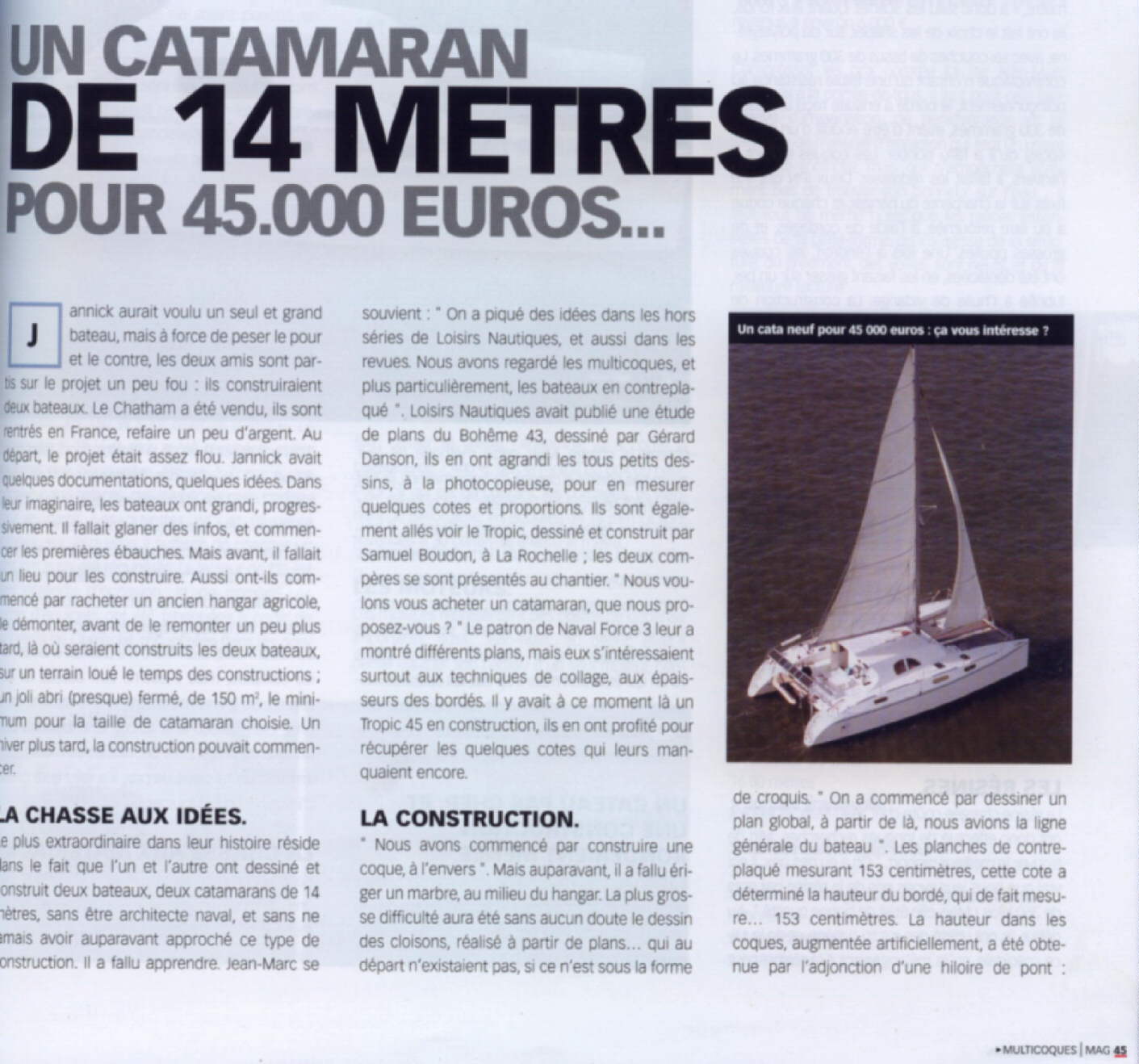 I send you as attachment a part of an article from the French Multihull Magazine from January of this year. This article describes the construction, of a plywood/glass/epoxy catamaran with a length of 13.65 m. This boat was built for Euro 45.000,- or US $ 54.000,-.