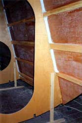 As can be observed on the picture, we use no stiffeners around the bulkheads. Instead, we apply fillets and glass fiber tape after planking. These safes time and give a very smooth hull.
