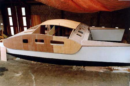 To speed up construction, the cabin roof is strip planked with red cedar strips and tree layers of glass fiber.