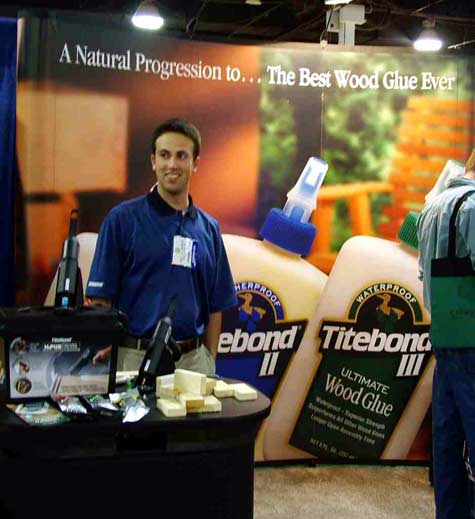 Like ‘bacon & eggs’, or ‘ham & Swiss’, wood goes with glue. The Titebond people {Franklin International} had a really tiny display. What they were ‘pushing’ was their new ‘hotgun’ system. Works like one of those ‘hotglue’ guns the ‘crafters’ use. I know Dynamite Payson has mentioned using ‘hotglue’ {along with Ductape, etc.}to hold seams together, temporarily. I’ve had no luck that way . . . ‘drywall’ screws and ‘backing blocks’ are my method of choice. HOWEVER, THIS stuff WOULD work !! A very small amount along a seam - or ‘spotted along’ as you go - about 5-10 seconds of hold time - and your ‘stuck’. A short period later and the wood will give before the glue line. The downside ?. . . it’s rather pricy. And so is the glue itself. It comes in tubes, about the typical 3.5 ounce size. It is inserted into the rear of the ‘gun’. While it can be changed out to a different formula, there really isn’t much of a ‘shelf life’ once opened. It’s one thing to ‘lose’ a $2 tube of RTV, but this stuff ?? Of course if you have a ‘production line’ set-up . . . this stuff should earn it’s keep. ME? . . . I walked away with several small bottles of Titebond III. I’ve had very good results with II and this is a cheap way to see if this has any practical problems - as a number of people have complained.