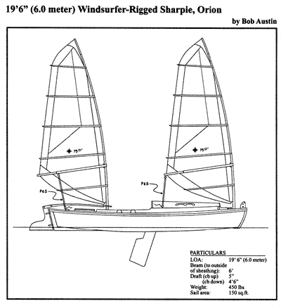 This is about everything I have on my windsurfer rigs and Orion. The building particulars (see below) were drawn up for a prospective draftsman who could not in the end produce. I am currently looking for someone who could produce a set of drawings and plans from what you see here. If you are interested in such a project or know anyone who might be, please email me.