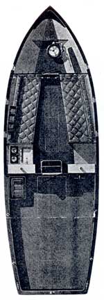 The Eico Twenty-Six is powered with an Elco-Gray model Z four-cylinder Marine Engine of i5-l8 horsepower, installed under the cockpit floor and accessible through flush hatches or by lifting away the cabin steps. Electric starting and lighting and enclosed reverse gear are regular equipment. Switches, starting button, fuses, ammeter, and choke are located just inside the cabin where they are protected from the weather.