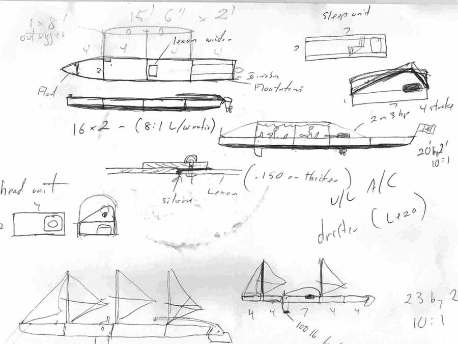 I plan to make the power unit shown in the preliminary sketch, and first try it with a trolling motor. With its 10:1 length to width ratio, she should go quite well with minimal power.