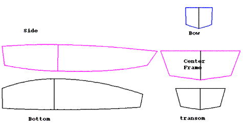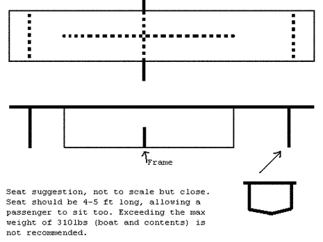 Construction is of standard stitch and glue techniques. Framing is light on the front and rear transoms, just to stiffen the flat panels up a bit. All framing can be installed on the assembled hull. If desired, you can use a center mold to bend the panels around as you stitch the boat together, but it is not necessary. The offsets for the center frame have been adjusted for ¼” ply, but may need some further tweaking. Remember, it is better to have a some gap to fill with epoxy as this makes a stronger joint. Trust to the shape of the panels to give the proper shape of the boat and all you will have to do is spread the beam to the correct width. The actual frame shape will vary with your choice of seating arrangements. A longitudinal (lengthwise) bench seat is what I would recommend as this allows you to adjust your position forward and back to help balance the boat. Couple this with multiple oarlock positions and you should have a decent comfort and stability zone. For this, a frame that is low across the middle and that runs up the side to support the sides at max beam would be best, somewhat like the pictures on the next page. The easiest way to do this is with a frame, seat and supports made with 1X pine or fir boards.