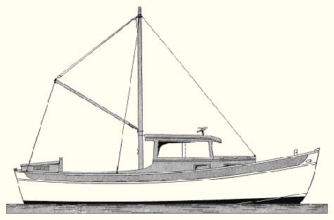 Jog-Along, is 22' 1" LOA; 20' LWL; 7' 10" breadth; and draws 1' 11" of water. Her cabin is 6' 4" long; the toilet room is 2' 9" long and is fitted with the smallest size pump water closet, headroom is 4' 3"; there is room beneath the waist deck for two shelves and on the bulkhead for a mirror; a seat on this side is 4' 6" long; there is comfortable sitting up headroom over this. The opposite side gives room for a small wood and coal-burning range, coal and wood stowage bin and a seat 4' 6" long. Under both these seats there is stowage space and room for a long shelf, and forward of both a forecastle. Headroom in the cabin is 4' 3" clear, just right for sitting. The after end of the pilot house or standing top is 3' long, its forward end projecting over the trunk cabin top, with cabin doors in the bulkhead. The cabin floor extends on nearly one level from the forward bulkhead to the after end of the pilot house, a length of 9' 4" by a width of from 20" to 26". Because we believe room in the interior, during the day, is more important than cluttering the cabin with bunks, we decided to use air mattresses for sleeping, simply laid on the cockpit floor, close up to the cabin bulkhead. One half the length of these will be covered by the pilot house overhead, the after ends protected from the elements by a removable khaki awning spread over the derrick boom.