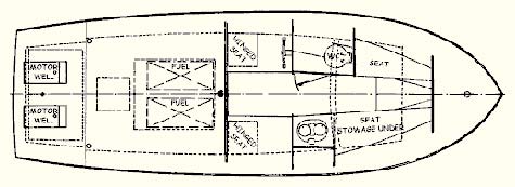 The motors are two 18 hp outboard units designed to drive Jog-Along at a comfortable 12 mph; propellers turning in wells are installed in the after compartment under a raised hatch; access to these is through the double covers. The motors will be fixed and not used for steering; a single rudder under the stern performs this service. gunwales to cover the ply edge.