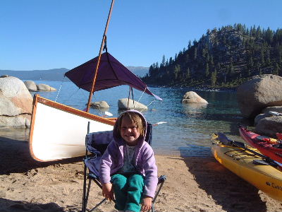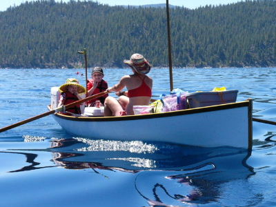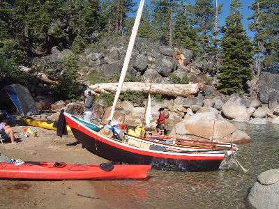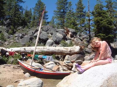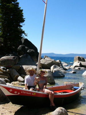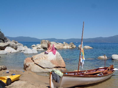 Took off from west side of Tahoe, sailed 10 miles across to skunk Harbor. Beautiful spot, but heavily watched by rangers. Found out it's not legal to camp on NV shores. But he left us alone. My newest boat is lght enough for Heather and I to load by ourselves, can carry a ton of gear, sleeps 4, row, sail and motor with 2hp.